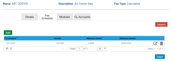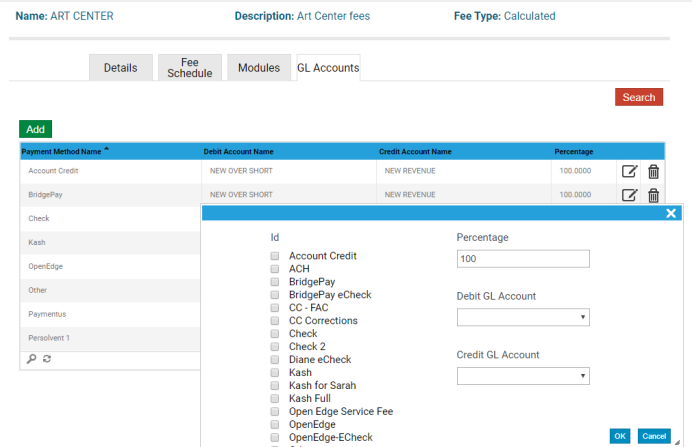 When you add or update a fee, you must assign a fee schedule and add at least one payment method with general ledger accounts: