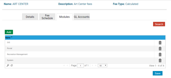 The Modules tab assigns the fee to a Parks & Rec module: