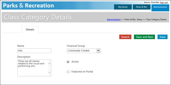 Administration > Parks & Rec Setup > Class Category