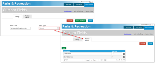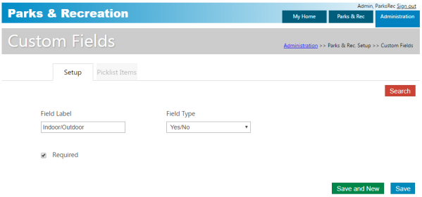 Selecting the Required check box causes the field to require an entry for end-users creating Parks & Rec records.
