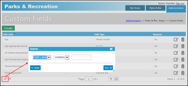 The Search option for custom fields lets you define search criteria using the field type and value.