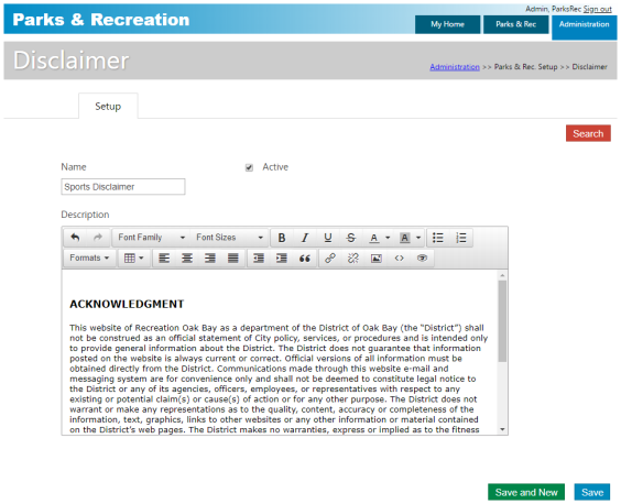 Administration > Parks & Rec Setup > Disclaimer