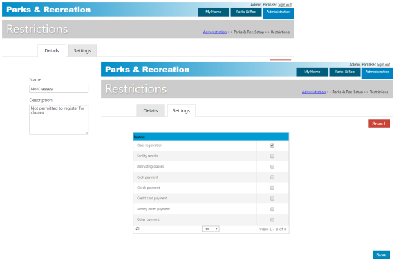 Administration > Parks & Rec Setup > Restrictions
