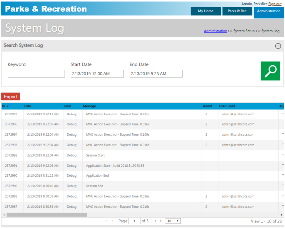 System Log provides details for your organization’s Parks & Rec application. Use the Keyword, Start Date, and End Date fields to define the search criteria for the log results. You may use the Keyword field to search by event ID or user email address in addition to keywords.