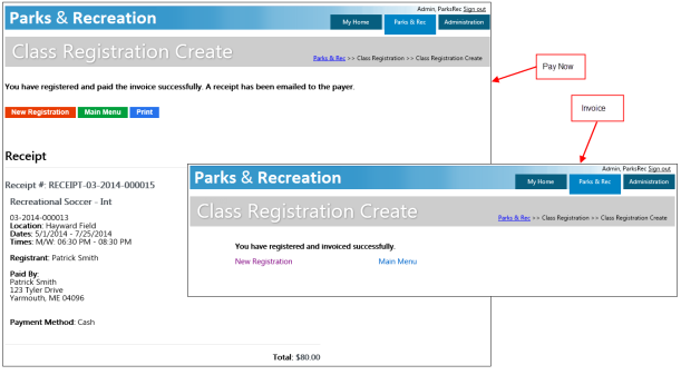 If you select Pay Now and the Email Receipt? check box is selected, the program sends a copy of the receipt to the email address provided. It also makes a printable payment receipt available. If you select Pay Later, the program displays an invoice confirmation.