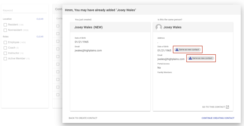 If the first and last name and one other item on the dialog match another contact already in the system, a duplicate prevention dialog opens, showing the new contact on the left and the original one on the right. If an entry on the new contact duplicates one on the original, a Same as new contact tag appears to the right of the duplicate entry on the original: