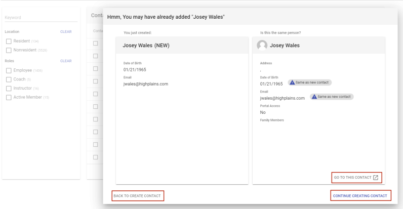 From the duplicate prevention dialog, you have the options to navigate to the Contact Details page of the original contact, return to the Create Contact dialog or continue the process of creating the new contact: