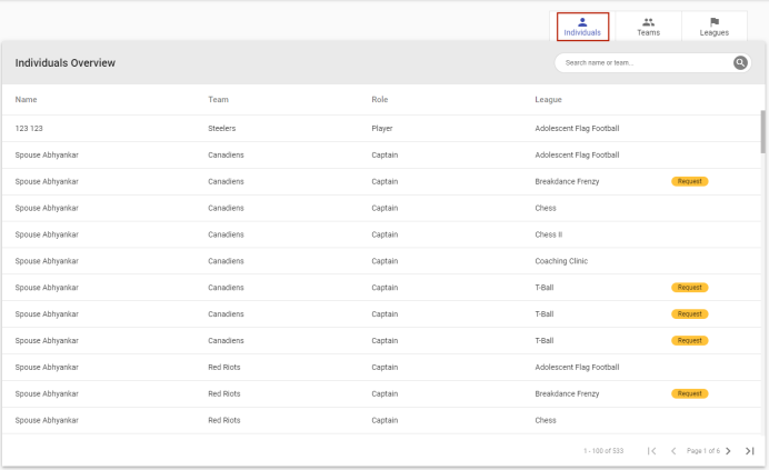 This grid provides a view of all the individuals enrolled in leagues, their teams, roles and league names.