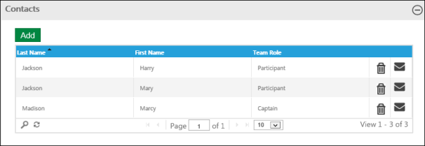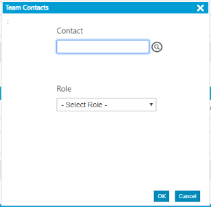 Contacts lets you add contacts to the team and to assign roles to the contracts according to the role types associated with the team type. You may not add contacts to a new team until you first save the team record. The Contacts table includes the Delete and Email options. (The Email option displays after you save the contact information.)