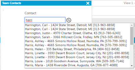 When you are adding a team contact, the Contact field includes auto-complete functionality. As you type the first few letters of a name, the program provides a list of existing options that match the text entered. The more text you enter, the narrower the list of options. When the list shows a match, click it to complete the field.