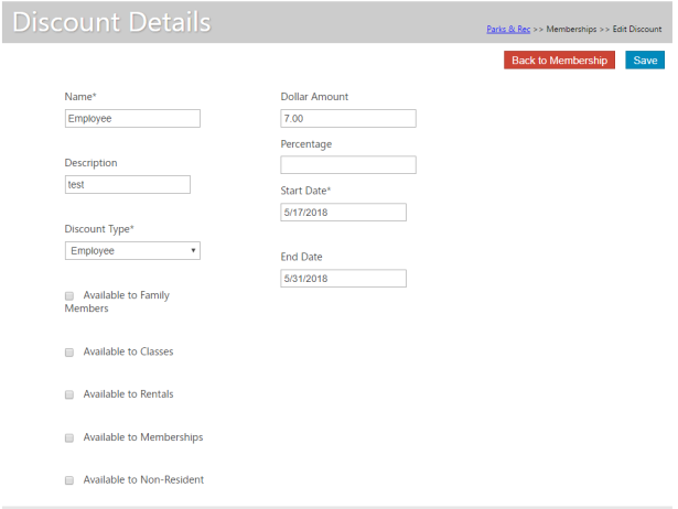 To return to the Membership Details page from the Discount Details page, click the Back to Membership button.