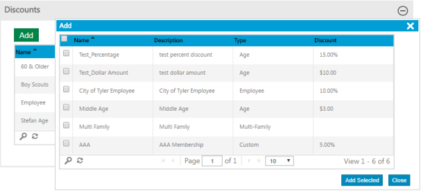 Clicking the Add button opens a dialog of the discounts that are available to be applied to the membership.