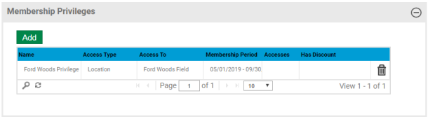 To add a privilege, click the Add button, and select from the Privilege Selection dialog. (Privileges that are available for selection are set up at Parks & Rec > Memberships > Privileges.)