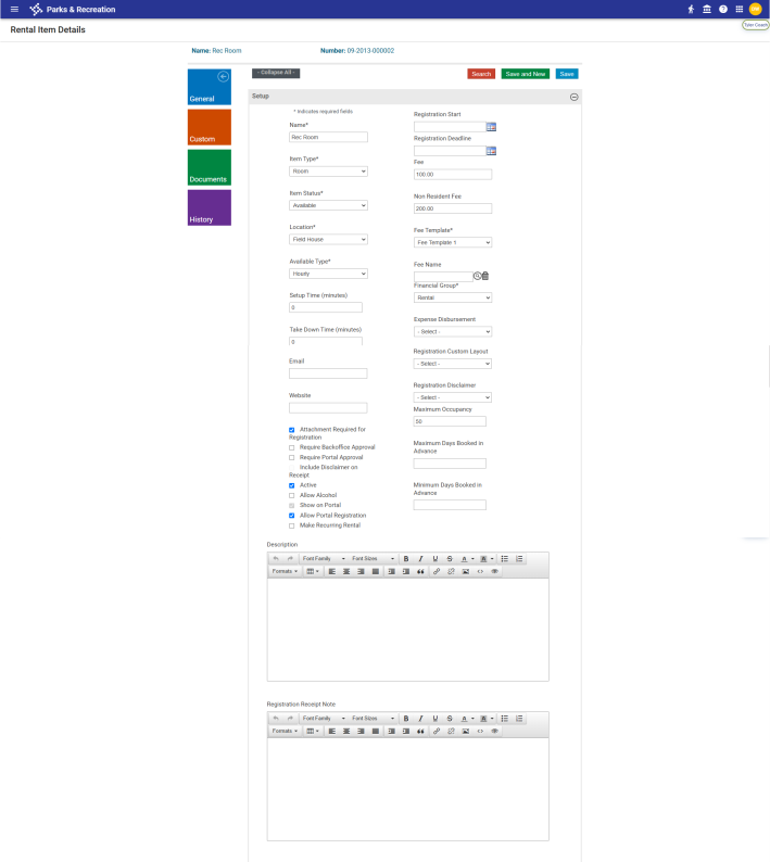 Parks & Rec > Rental Item > Create (or Search > Edit)