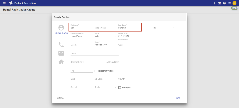 After you have entered the required contact information and clicked NEXT, the contact's name populates the Payer field:
