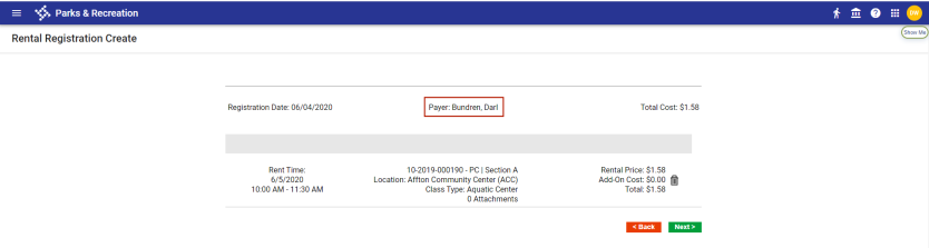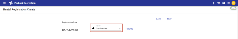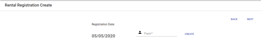Selecting a Payer is the last step of the rental registration create process. This step also displays the registration date and provides a CREATE button if you need to add a contact to the system and select that person as the payer.