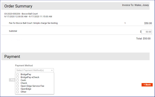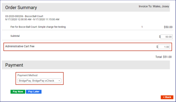 Select the payment methods that will be used in Cashiering. If cart fees have been applied to any of the selected methods, the cart fee line item displays: