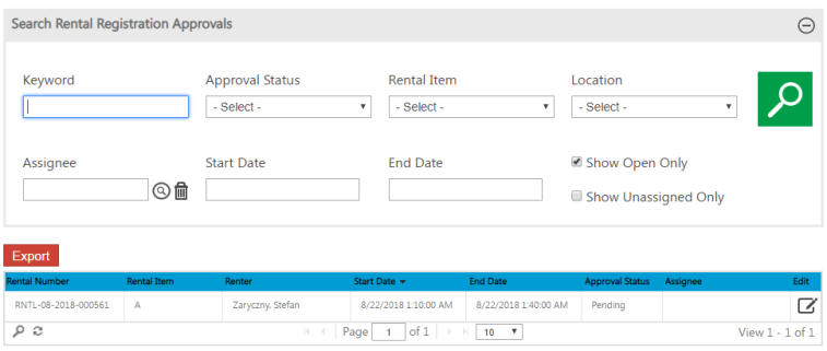 Selecting the Show Unassigned Only option in the search criteria limits search results to rental registrations that require approval but to which an approver has not been assigned.