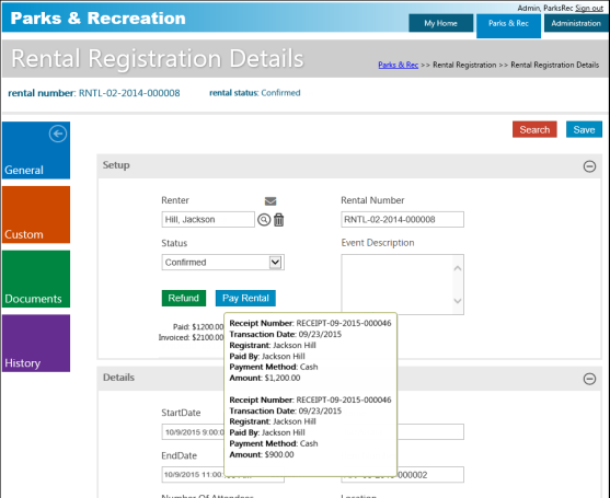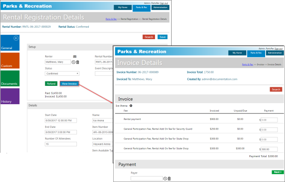 When you complete a rental registration for which you issue an invoice, the Registration Details page provides the View Invoice option. Clicking this option opens the Invoice Details page showing the invoiced item or items and letting you make payments for outstanding amounts. Registrants may make continuous payments until the invoice is paid in full.