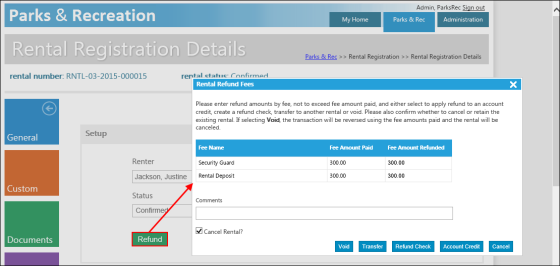 To refund paid amounts directly from the Rental Registration Details page, click Refund to initiate the refund process. Refund options vary according to the refund permissions assigned to your user role.