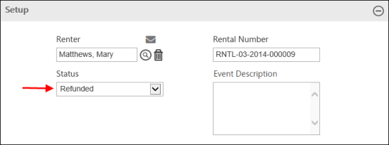 When you complete the refund, the Status entry on the Rental Registration Details page resets to Refunded, and the Refund button no longer is available.