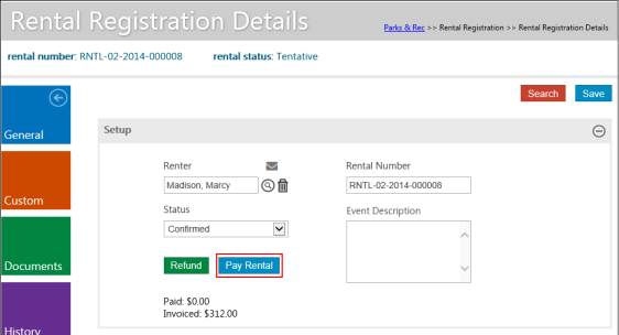 The Rental Registration Details page also lets you complete payment on a rental. To initiate the registration payment process directly from the Rental Registration Details page, click Pay Rental: