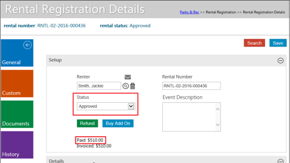 You are returned to the Rental Registration Details page, and the Status of the rental is updated to Approved.