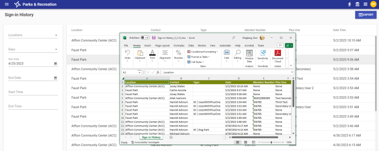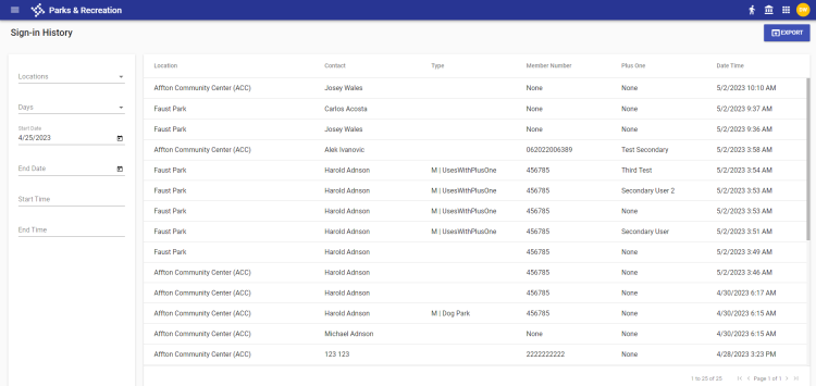 Use the EXPORT button in the top-right corner of the page to export filtered results to an Excel file: