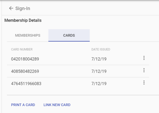 On the following page, the right panel contains the sign-in details and a button for returning to the sign-in, and the left panel contains the contact's name and photo and buttons for viewing membership details and linking a new card.