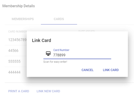 The LINK NEW CARD button opens a dialog for scanning or entering a card number for a card printed outside of Parks & Rec.