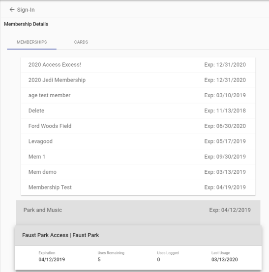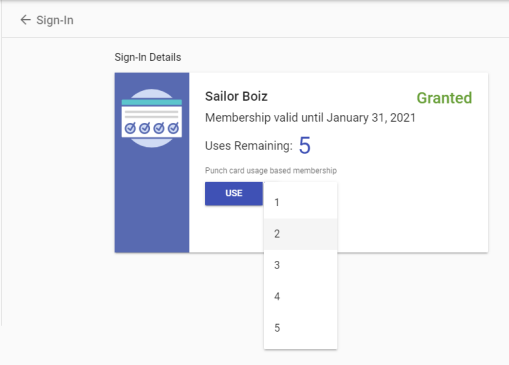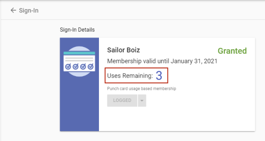 The Sign-in Details show the membership providing access to the location, the membership expiration date and the number of uses remaining. If the contact has multiple memberships, the one that expires first is shown, and usage is deducted from that one.