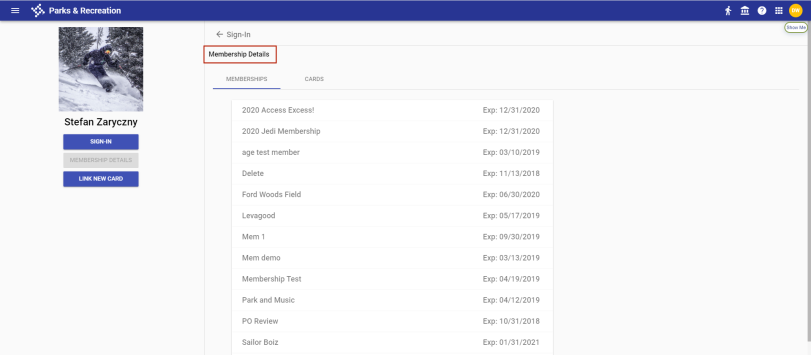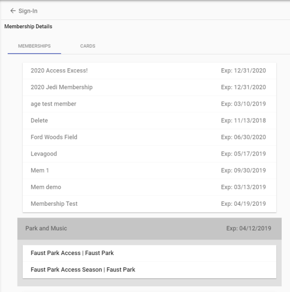 Memberships display on individual cards on the Memberships tab. To view the privilege and location associated with a membership, click the corresponding card to expand it.