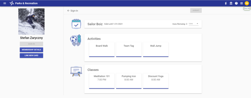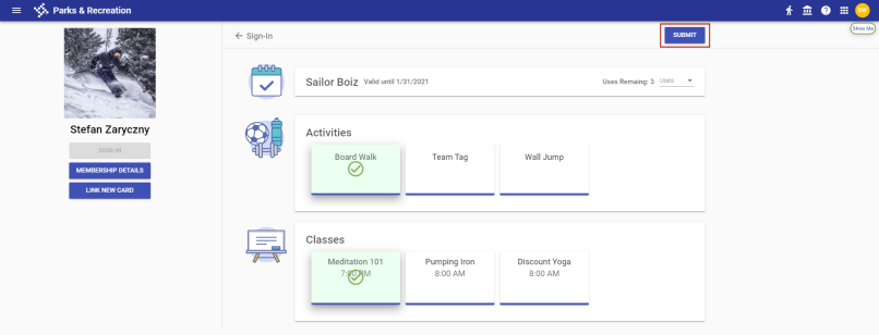 Memberships, classes and activities appear on individual cards. Select the appropriate cards, and click SUBMIT.