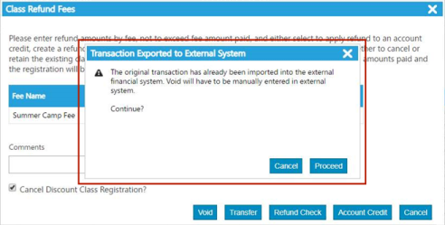 If a collection has been exported, attempting a void notifies the user of the need to adjust the external financial system manually.