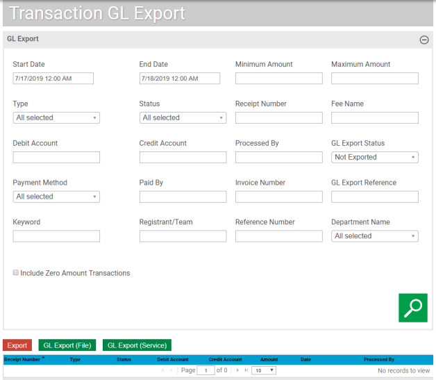 To include $0.00 receipts in the GL export, select the Include Zero Amount Transactions check box.