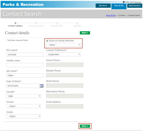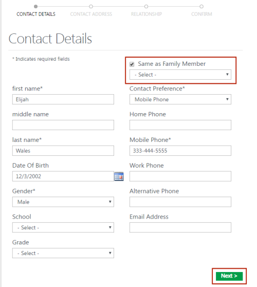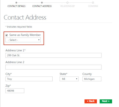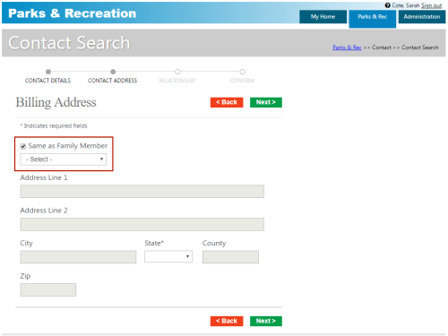 The same as parent/guardian check box has been renamed Same as Family Member. Selecting this check box on the Contact Details or Billing Address page in the back office displays a drop-down with any relationship contacts 18 or older. After a family member is selected, any future changes made to the family member also will be applied to the contact with the setting enabled.