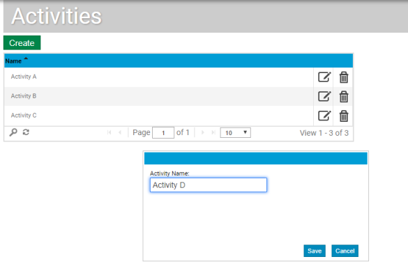 Click the Create button to add an activity, the edit icon to edit one. In either instance, a dialog opens, containing a field for the Activity Name.