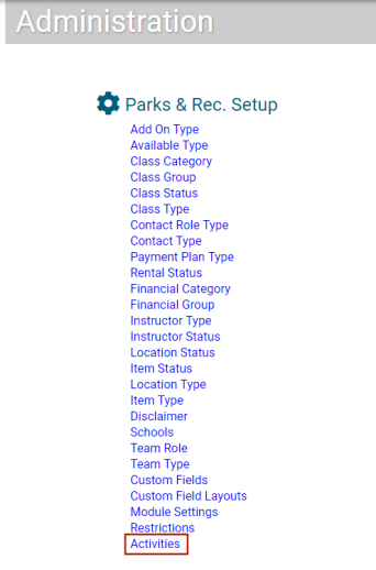 An Activities option has been added to the Parks & Rec. Setup section of the Administration tab.