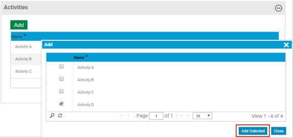 Click the Add button. In the Add dialog that opens, select the activity or activities and click the Add Selected button.