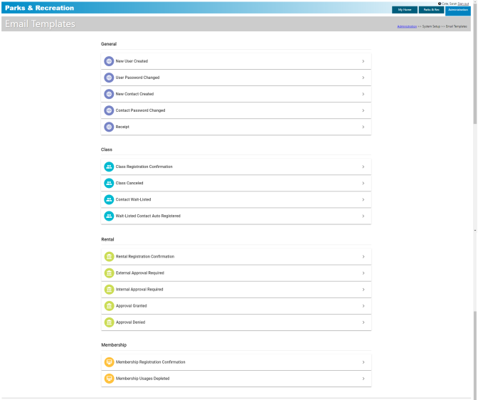 An Email Templates option has been added to the System Setup menu in Administration. This option provides a central location for the email templates used to draft custom emails that are sent automatically when various events occur.