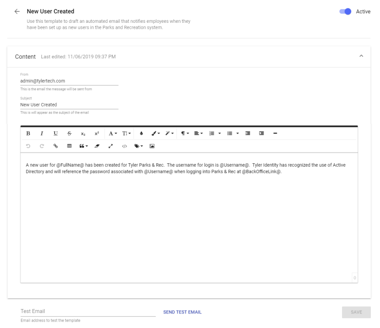 A New User Created email template has been added to the General category with default content to provide new users with log-in instructions now that Parks & Rec is integrated with Tyler Identity: