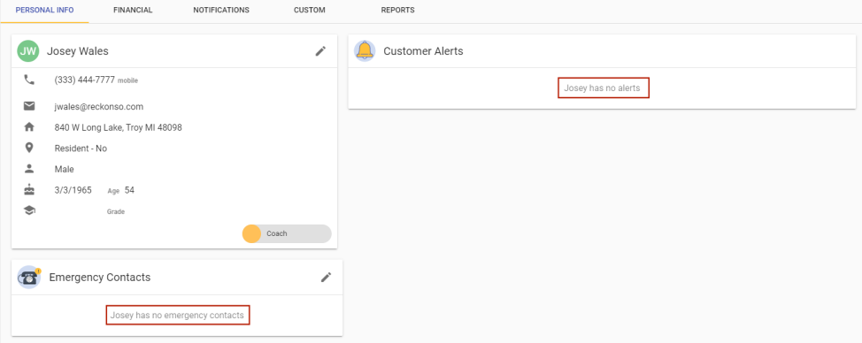 If a section of a contact's page does not contain records, a label displays in the section--for example, Josey has no emergency contacts:
