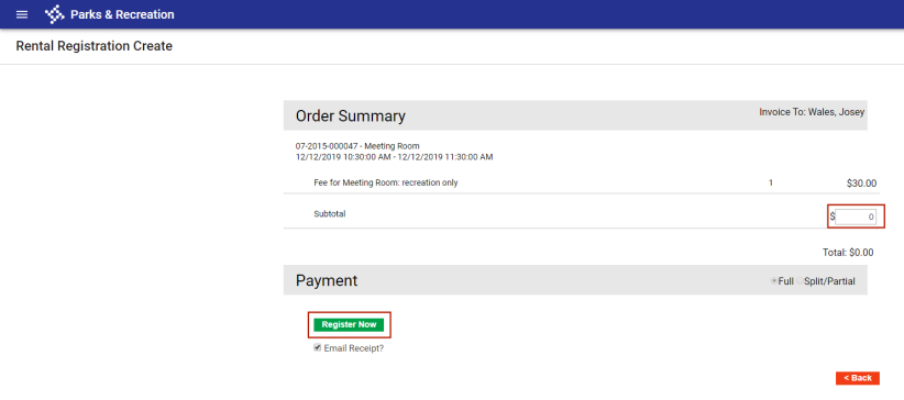 If the Subtotal is changed to $0.00 during the payment process for classes, rentals, memberships or add-ons, the Pay Now, Pay Later and Cashiering buttons are replaced by a Register Now button: