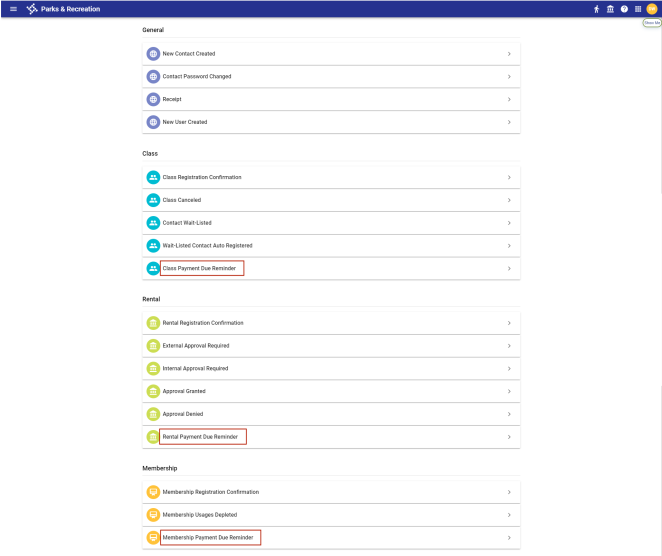Three time-based templates--Class Payment Due Reminder, Rental Payment Due Reminder and Membership Payment Due Reminder--have been added to the Email Templates page in System Setup: