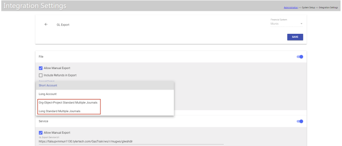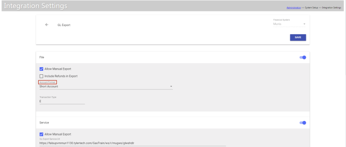 For the Munis Financial System, an Account Format drop-down field has replaced the Use Full Account check box on the GL Export File card: