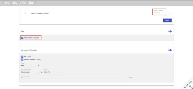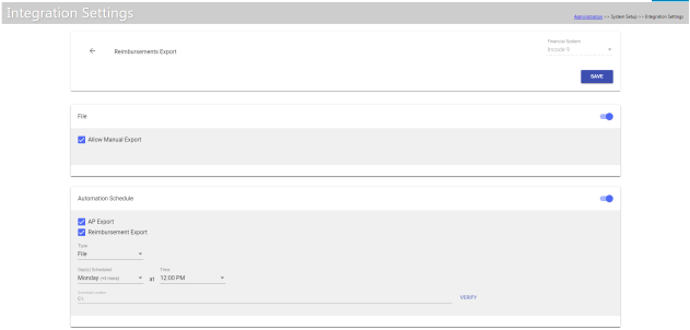 If Incode 9 is selected as the Financial System in Integration Settings, selecting the Allow Manual Export setting on the Reimbursements Export card will enable the display of the file export button on the AP Export and Reimbursement Export: