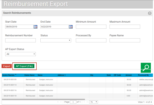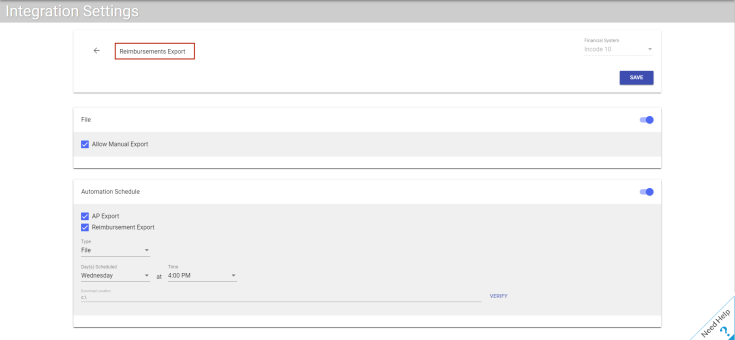 A Reimbursements Export option has been added to Integration Settings for the Incode 10 Financial System. This option provides the ability to export from the AP and Reimbursement Export pages or through the Automation Scheduler: