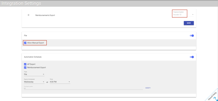 If Incode 10 is selected as the Financial System in Integration Settings, selecting the Allow Manual Export setting on the Reimbursements Export card enables the display of the file export button on the AP Export and Reimbursement Export: