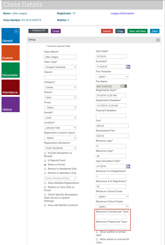Maximum Coaches per Team and Maximum Players per Team have been added to the Class Details page and will appear whenever a Class Type Format of League Individuals is used.