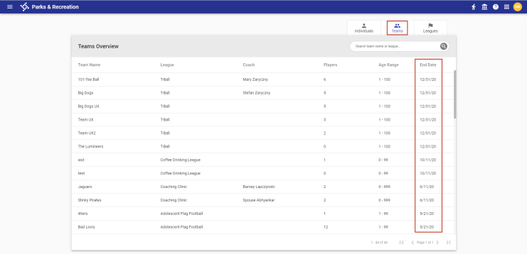 An End Date column has been added to the gird on the Teams Overview page. The records display in descending order by End Date followed by Team Name in ascending order: